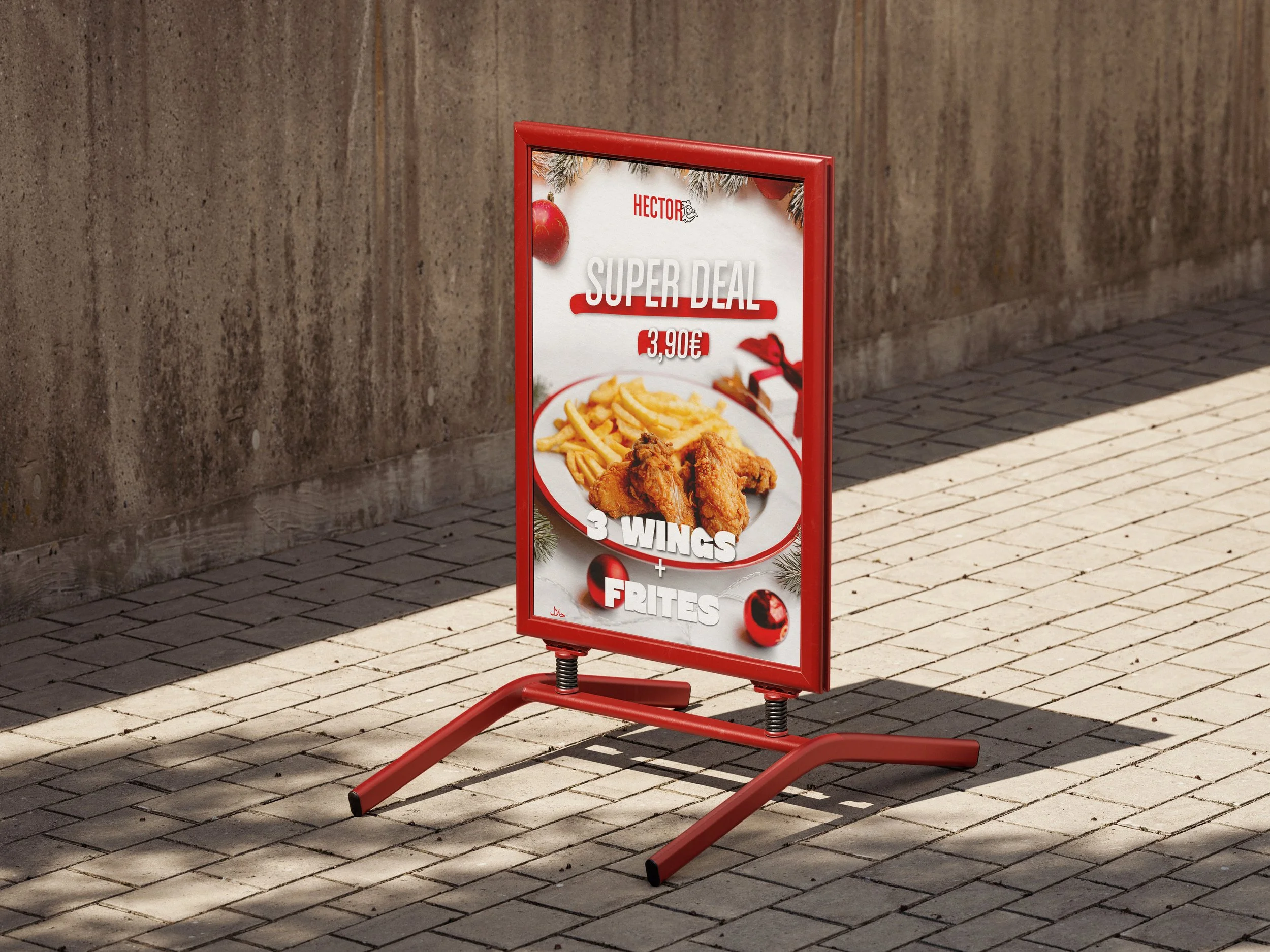 Il s’agissait de concevoir un stop trottoir pour le Hector Chicken de Liège, afin de promouvoir une offre spéciale durant les fêtes de fin d’année.